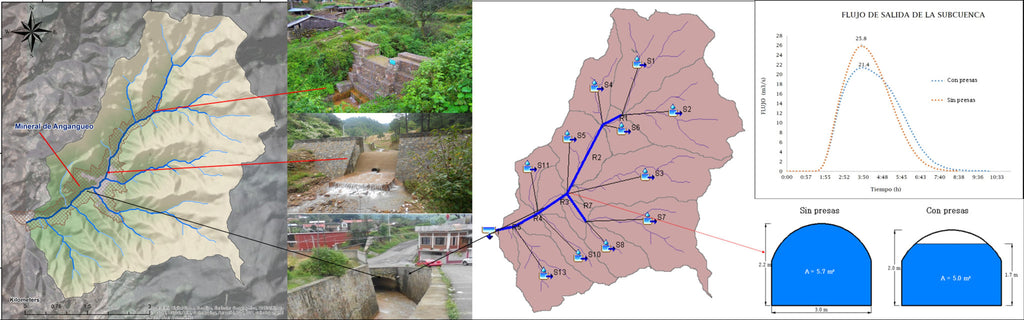 En 2016 Se simuló la respuesta hidrológica de la microcueca mineral de Angangueo Michoacán, con y sin obras de control y regulación de avenidas, con el modelo HEC-HMS, para evaluar la efectividad y el impacto que tiene en el control de avenidas aguas abajo de la microcuenca (Zonas urbanas).